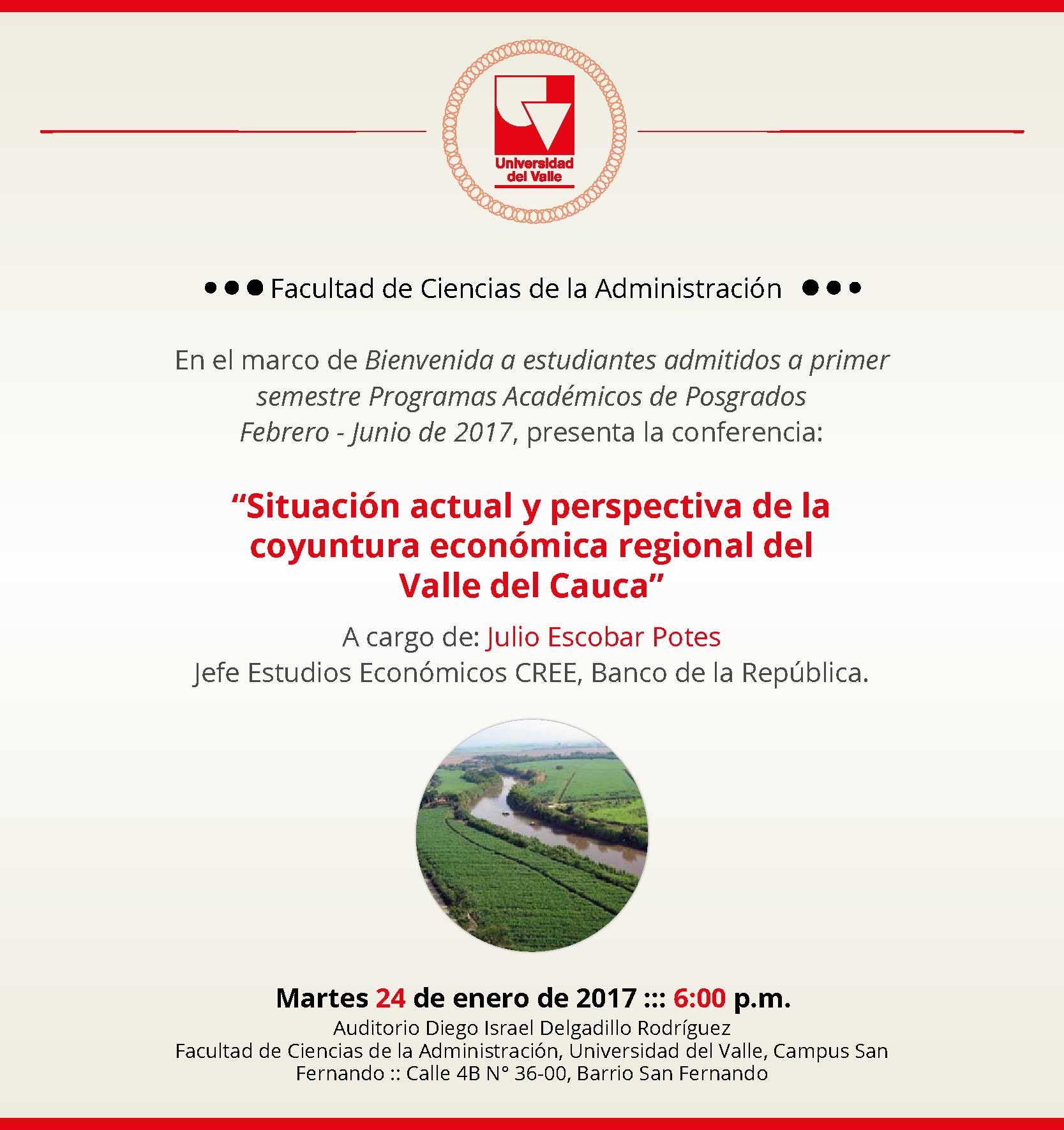 En procura de complementar los conocimientos que favorezcan la formación integral de los estudiantes de posgrados, se presentará la conferencia central “Situación actual y perspectiva de la coyuntura económica regional del Valle del Cauca”: