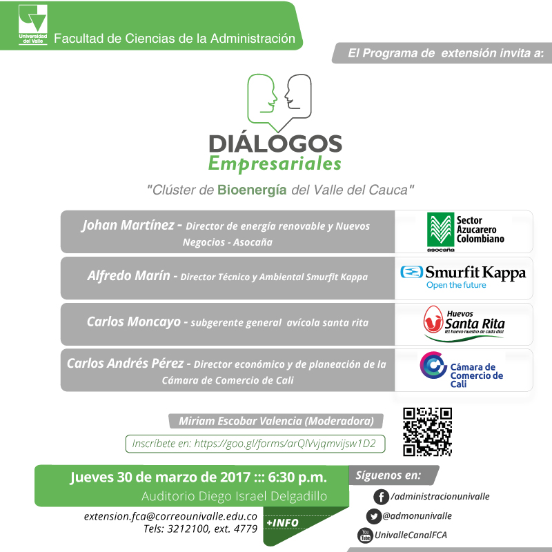 La Facultad de Ciencias de la Administración de la Universidad del Valle, a través de su programa de extensión, invita a la comunidad universitaria y público en general al evento Diálogos Empresariales “Clúster de Bioenergía del Valle del Cauca”, el próximo jueves 30 de marzo a las 6:30 p.m. en el auditorio Diego Israel Delgadillo, campus San Fernando.