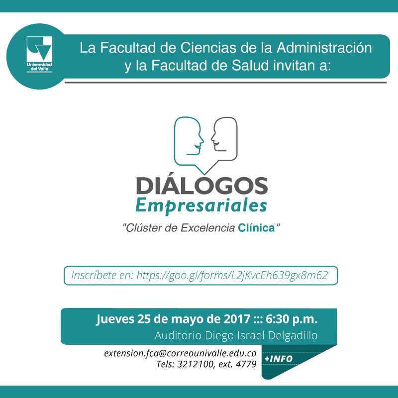 La Facultad de Ciencias de la Administración de la Universidad del Valle invita a la comunidad académica y público en general a la sesión de Diálogos Empresariales: Clúster de Excelencia Clínica: un conversatorio en el cual se presentarán las distintas alianzas y estrategias que permitirán generar nuevas alternativas para lograr mayor competitividad, desarrollo y accesibilidad para brindar un mejor servicio de salud a los distintos usuarios.