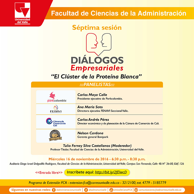 El clúster de la proteína blanca, que agrupa las empresas relacionadas con la producción avícola y porcícola, es el tema de la séptima sesión de los Diálogos Empresariales de la Facultad de Ciencias de la Administración de la Universidad del Valle. Actividad a realizarse el próximo miércoles 16 de noviembre, a partir de las 6:30 p.m., en el Auditorio Diego Delgadillo, Campus San Fernando.
