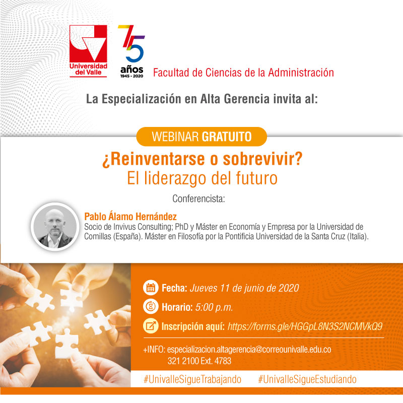 En la agenda de eventos virtuales en torno a la administración y los negocios en el marco de la Covid-19, la Especialización en Alta Gerencia de la Facultad de Ciencias de la Administración de la Universidad del Valle, invita a la comunidad universitaria y público en general a la conferencia ¿Reinventarse o sobrevivir? El liderazgo del futuro, la cual estará a cargo de Pablo Álamo Hernández, Ph.D. y Máster en Economía y Empresa por la Universidad de Comillas (España).
