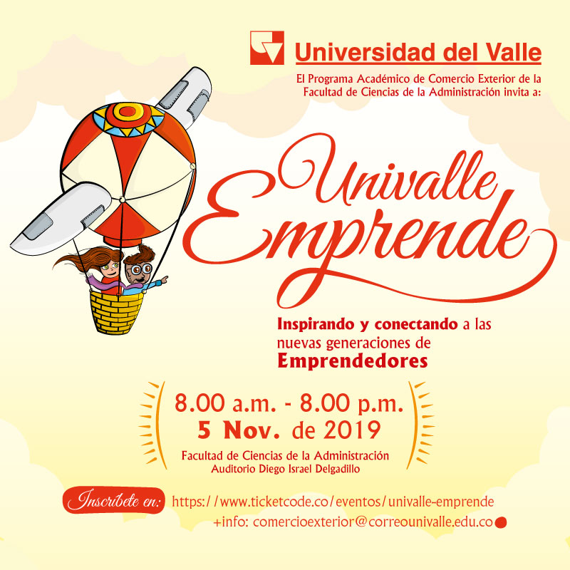 El Programa Académico de Comercio Exterior de la Facultad de Ciencias de la Administración de la Universidad del Valle, llevará a cabo el próximo martes 05 de noviembre del 2019, a partir de las 8:00 a.m., en el auditorio Diego Israel Delgadillo, el evento “Univalle Emprende, inspirando y conectando a las nuevas generaciones de Emprendedores”.