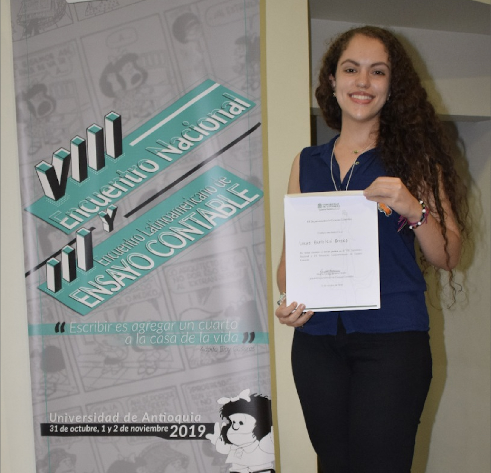 Lucero Buriticá Orozco, estudiante del Programa Académico de Contaduría Pública, obtuvo el tercer lugar en el VIII Encuentro Nacional y III Encuentro Latinoamericano de Ensayo Contable, evento realizado por el Departamento de Ciencias Contables de la Facultad de Ciencias Económicas de la Universidad de Antioquia entre el 31 de octubre y el 2 de noviembre de 2019.