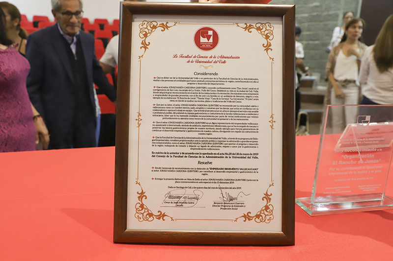 En el mes de diciembre de 2019, la Facultad de Ciencias de la Administración de la Universidad del Valle, le hizo entrega de la distinción “Empresario Benemérito Vallecaucano”, dicho reconocimiento tiene como propósito exaltar ante la opinión pública a grandes empresarios que aportan al progreso y desarrollo de la región, trabajando de corazón y dejando un legado de admiración, respeto y amor por el emprendimiento vallecaucano.