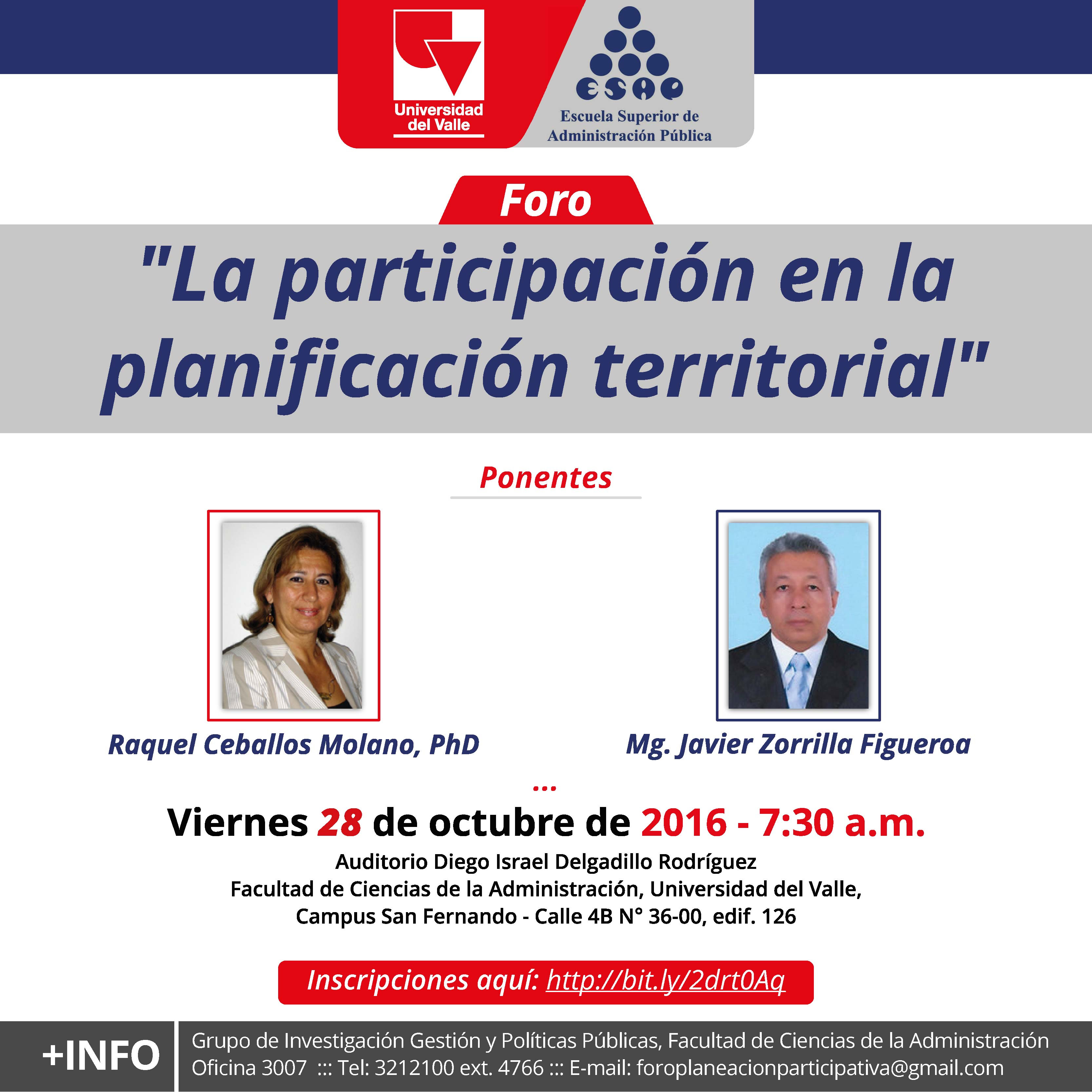 La Escuela Superior de Administración Pública y la Universidad del Valle invitan a la comunidad académica y comunidad en general a participar del Foro: La Participación en la Planificación Territorial. Evento que tiene como propósito generar un espacio de encuentro académico e institucional que permita la reflexión sobre la planificación participativa en Santiago de Cali, con especial énfasis en el Sistema Municipal de Planificación. La actividad se realizará este viernes 28 de octubre de 2016, en el Auditorio Diego Israel Delgadillo de la Universidad del Valle sede San Fernando de 8 a.m. a 5 p.m.