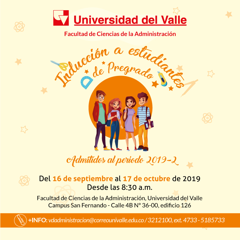 Desde el próximo 16 de septiembre hasta el 17 de octubre de 2019, la Facultad de Ciencias de la Administración iniciará el proceso de inducción para estudiantes de primer semestre de pregrado de la jornada diurna, admitidos a los programas académicos de Administración de Empresas, Contaduría Pública y Comercio Exterior.