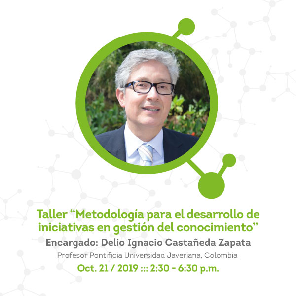 El día 21 de octubre de 2:30 a 6:30 p.m. en el Auditorio Diego Israel Delgadillo Rodríguez del Campus San Fernando, se realizará el taller Metodología para el desarrollo de iniciativas en gestión del conocimiento, a cargo del Dr. Delio Ignacio Castañeda Zapata, profesor de la Pontificia Universidad Javeriana, Colombia.