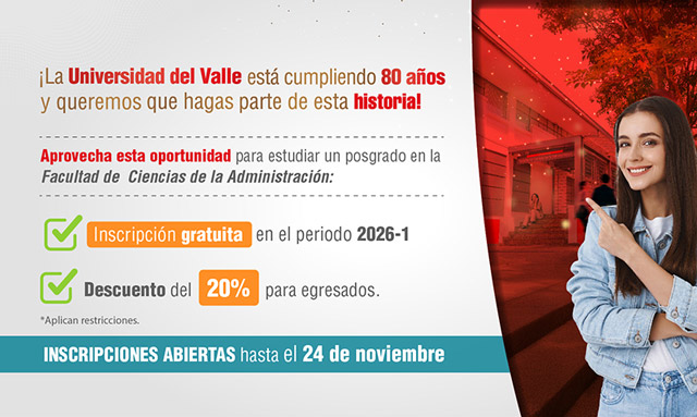 La Facultad de Ciencias de la Administración de la Universidad del Valle informa que ya se encuentran abiertas las inscripciones a los programas de posgrado, disponibles hasta el 24 de noviembre. Con una oferta académica amplia y diversa que incluye doctorados, maestrías y especializaciones, la Facultad continúa consolidándose como un referente en la formación avanzada de profesionales en la región y el país.
