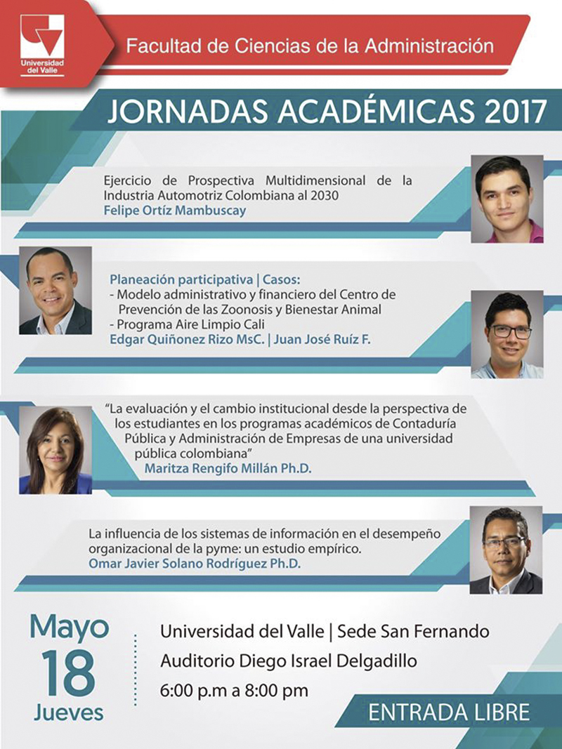 La Facultad de Ciencias de la Administración y el Instituto de Prospectiva, Innovación y Gestión del Conocimiento de la Universidad del Valle invitan a la segunda versión de las “Jornadas Académicas”, el jueves 18 de mayo de 2017, a partir de las 6:00 p.m., en el Auditorio Diego Israel Delgadillo, Campus San Fernando.