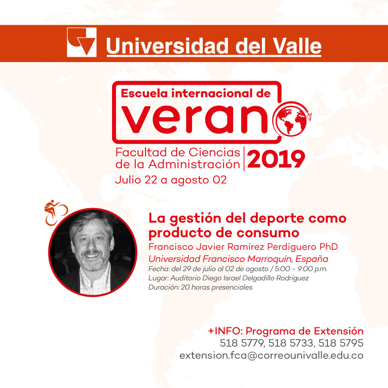 En el marco de la Escuela Internacional de Verano que realiza la Facultad de Ciencias de la Administración de la Universidad del Valle, se dará inicio, el próximo lunes 29 de julio de 2019 al tercer seminario académico titulado: La gestión del deporte como producto de consumo el cual estará a cargo del profesor Francisco Javier Perdiguero de la Universidad Francisco Marroquín, España.