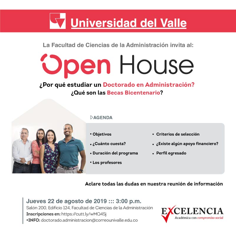 La Vicedecanatura de Investigaciones y Posgrados llevará a cabo el próximo jueves 22 de agosto a las 3:00 p.m. en el Salón 200 del campus San Fernando, el Open House ¿Por qué estudiar un Doctorado en Administración?.