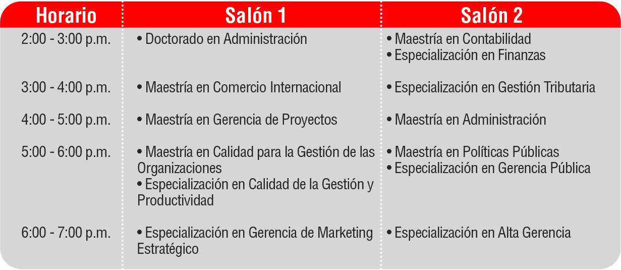 En cada una de las sesiones, los directores de los programas académicos dispondrán de 20 minutos para hacer una presentación general del posgrado y posteriormente se abrirá un espacio de 40 minutos, para resolver dudas e inquietudes sobre procesos relacionados con modalidades de financiamiento, beneficios económicos, inscripciones y mucho más.