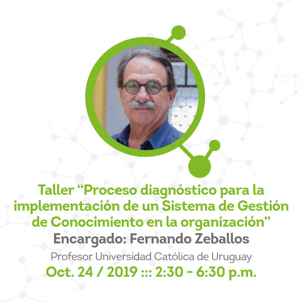 Entre los talleres que harán parte de la agenda académica, se encuentra el “Proceso diagnóstico para la implementación de un Sistema de Gestión de Conocimiento en la organización”, a cargo del invitado internacional Fernando Zeballos Méndez, profesor de la Universidad Católica de Uruguay.