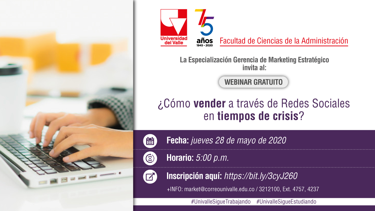 Por solicitud de las personas inscritas al webinar gratuito ¿Cómo vender a través de Redes Sociales en tiempos de crisis?, la Facultad de Ciencias de la Administración decidió aplazar este evento para el próximo jueves 28 de mayo, en un horario más accesible para el público: 5:00 p.m. Agradecemos su amable comprensión y los invitamos agendarse para la nueva fecha.