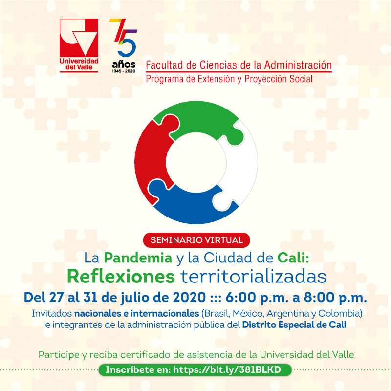 En este contexto, la Facultad de Ciencias de la Administración de la Universidad del Valle y los grupos de investigación Gestión y políticas públicas y Nuevo Pensamiento Administrativo, han organizado el Seminario La pandemia y la ciudad de Cali, reflexiones territorializadas, un curso virtual gratuito cuyo propósito es reflexionar de forma compartida sentires sobre los problemas sociales y las formas de acción colectiva que se tienen y se pueden proyectar para enfrentar este nuevo desafío social, organizacional y comunitario que impone la pandemia.