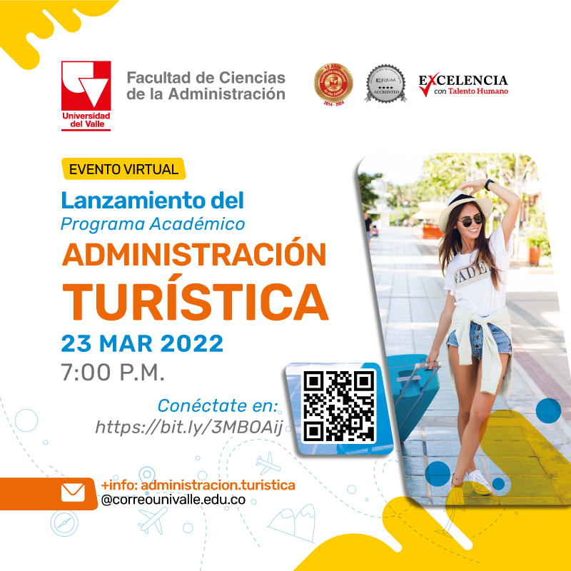 El próximo 23 de marzo a las 7:00 p.m., se llevará a cabo, en modalidad virtual, el evento de lanzamiento del nuevo programa de Administración Turística de la Facultad de Ciencias de la Administración de la Universidad del Valle.