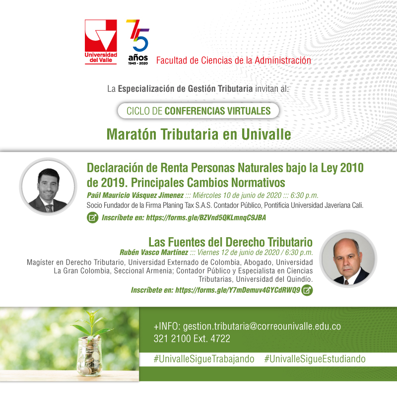 La Especialización en Gestión Tributaria de la Universidad del Valle realizará el próximo 10 y 12 de junio de 2020, el ciclo de conferencias virtuales Maratón tributaria, la cual le permitirá a los participantes conocer los cambios que tiene la ley 2010 de 2019 y aprender cómo abordarlos de cara a los próximos vencimientos de Impuesto a la Renta de Personas Naturales.