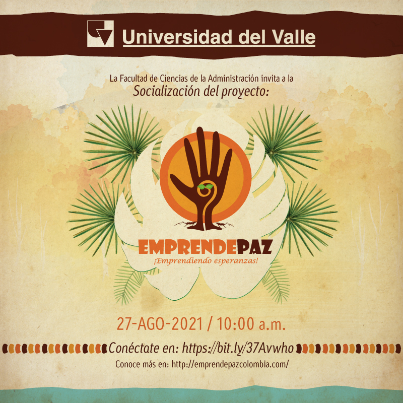 La Facultad de Ciencias de la Administración de la Universidad del Valle invita a la comunidad universitaria y público en general, a participar en la socialización del Proyecto Emprendepaz, evento que se llevará a cabo el viernes 27 de agosto de 2021, a las 10:00 a.m. de manera virtual.