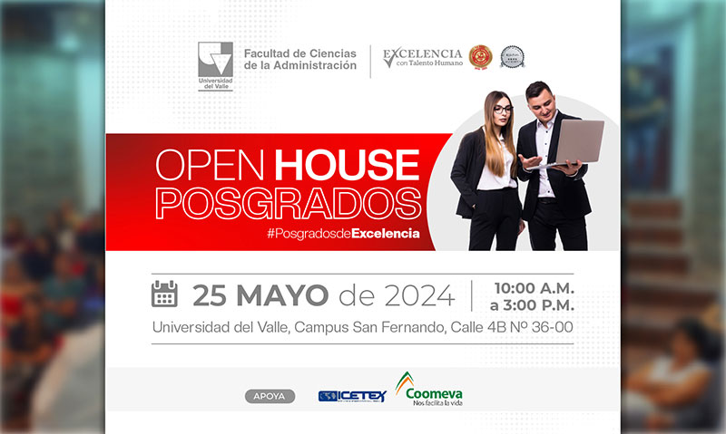 La Facultad de Ciencias de la Administración de la Universidad del Valle, con el propósito de brindar una experiencia personalizada a todos aquellos interesados en iniciar estudios de posgrado, abrirá sus puertas el próximo sábado 25 de mayo a partir de las 10 a.m. en el Campus San Fernando (Calle 4B N. 36-00) para llevar a cabo el Open House de Posgrados correspondiente al calendario de inscripciones 2024-2.